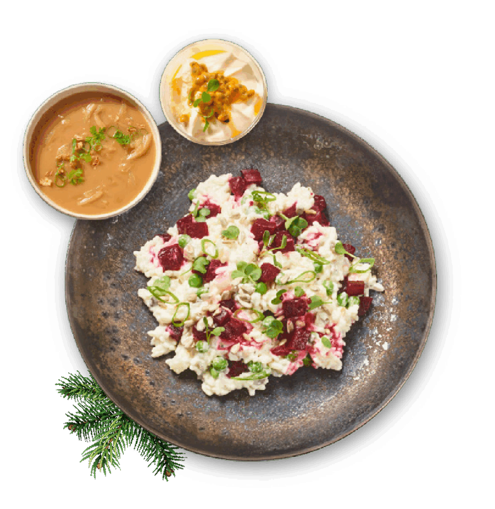 Kerstmenu vega: Risotto met geitenkaas, rode biet, doperwten en selderij