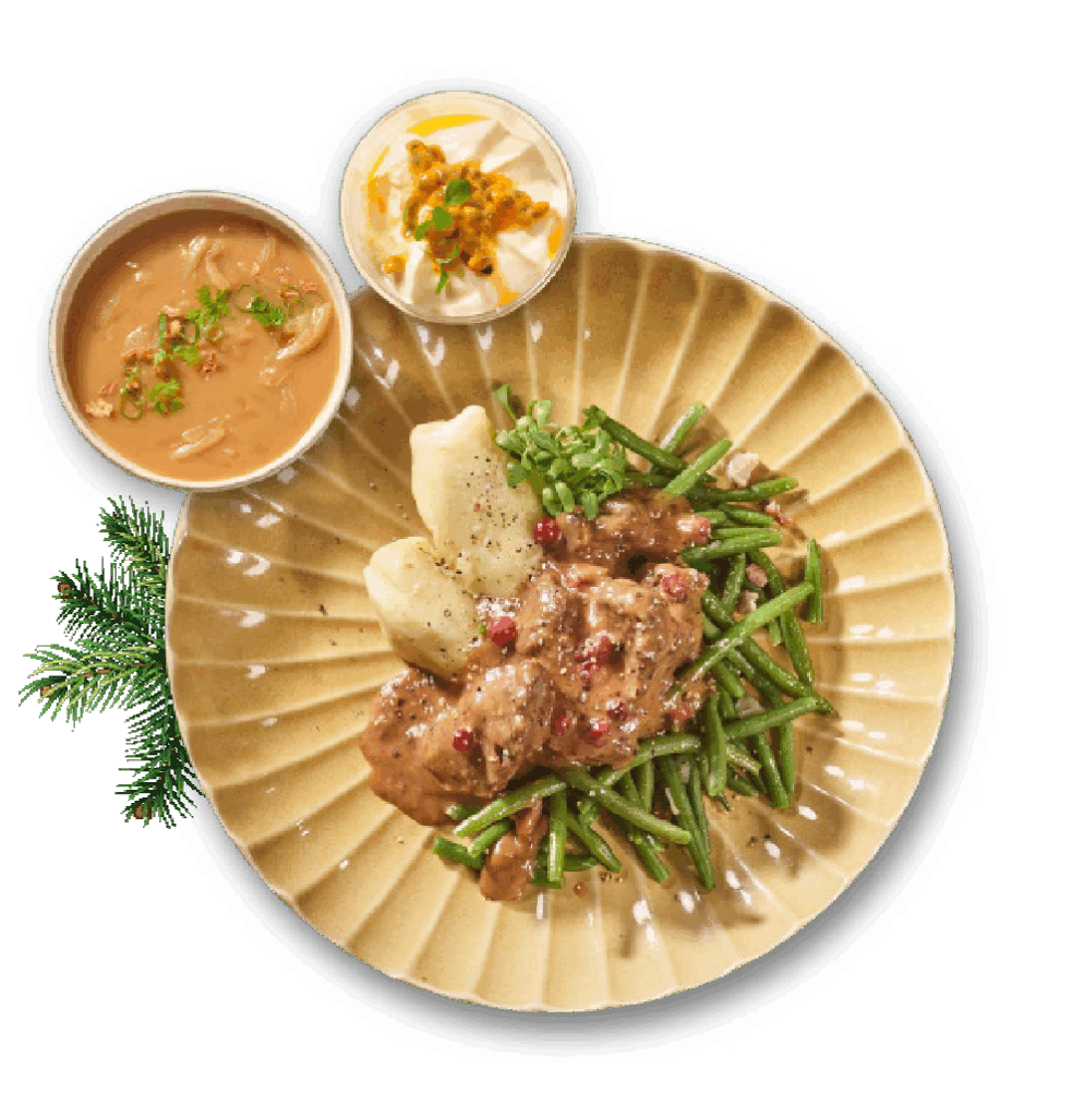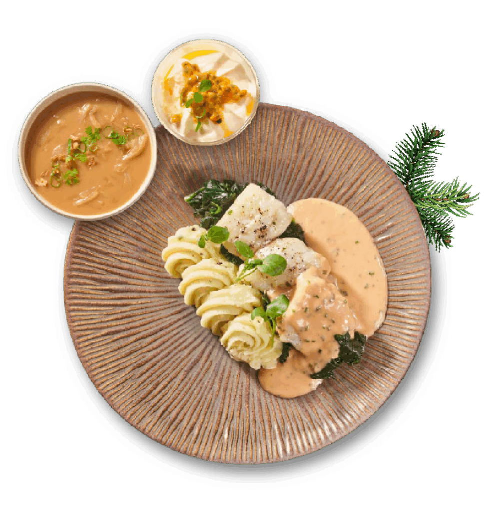 Elk menu begint met Franse uiensoep, gevolgd door een hoofdgerecht naar keuze (vlees, vis of vega) en tot slot een luchtige passievruchtmousse. Liever alleen een hoofdgerecht, soep of dessert? De zijn ook los te bestellen.